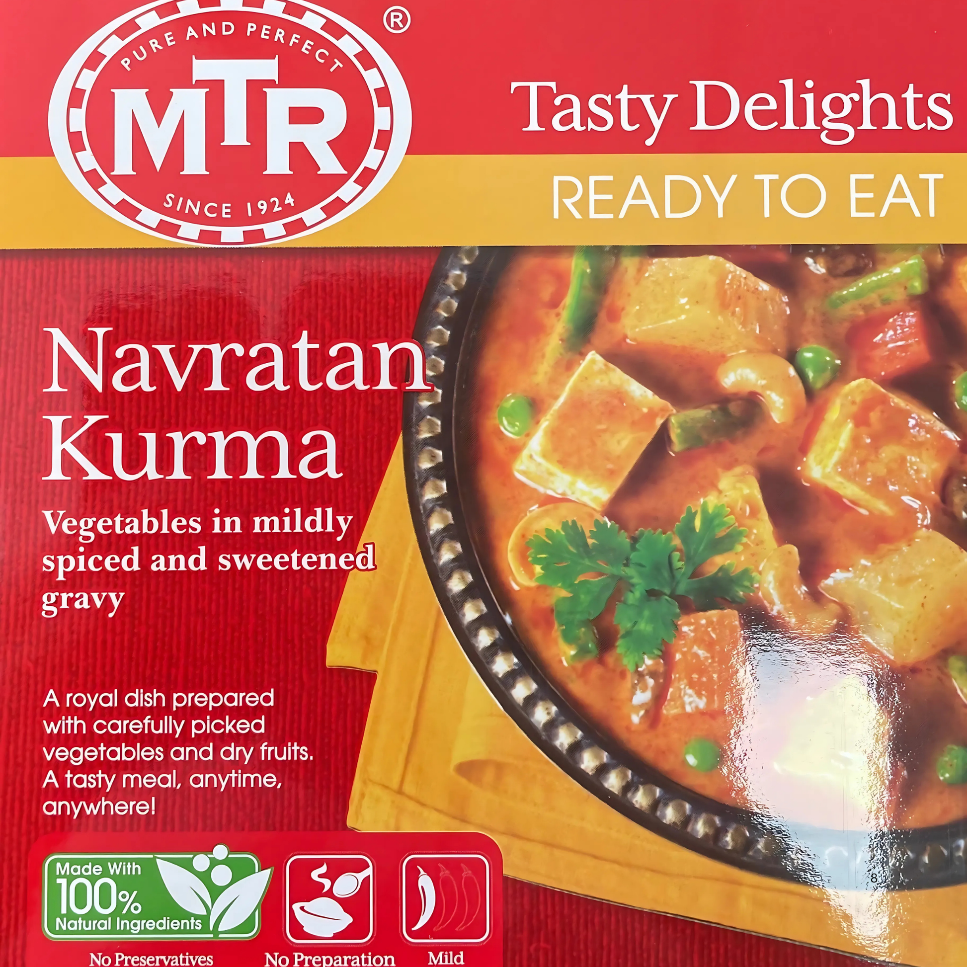 MTR Navratan Korma is a ready-to-cook mix from MTR Foods that helps you prepare the classic Indian dish, Navratan Korma, quickly and easily. Navratan Korma is a rich, mildly spiced curry made with a variety of vegetables and dry fruits, simmered in a creamy gravy, making it a flavorful and luxurious dish often served at special occasions or celebrations.